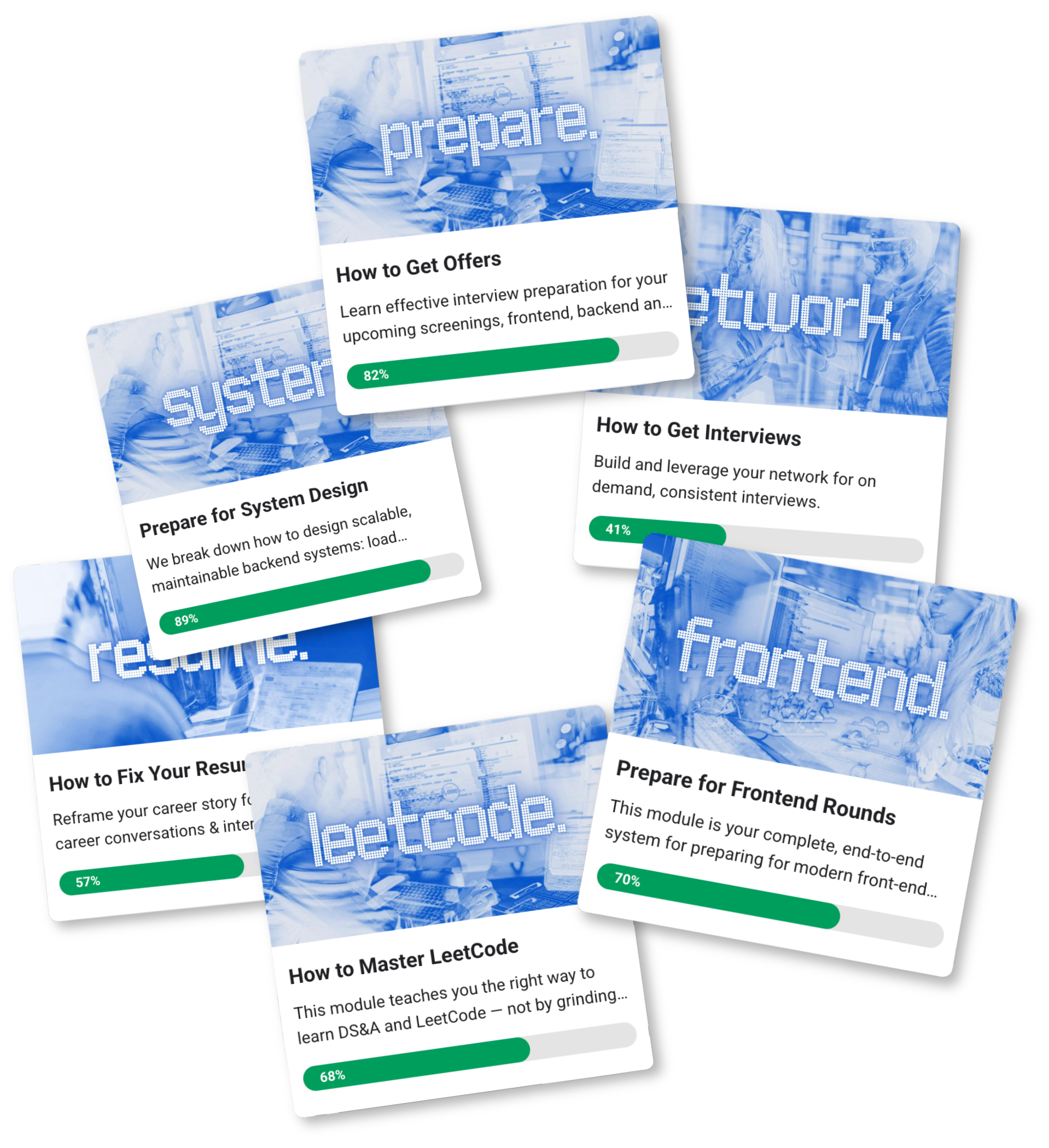 Get access to the step-by-step process and join our Exclusive Community of Software Engineers building towards ultimate career control — i.e. the ability to land consistent interviews an offers regardless of what the job market is doing.